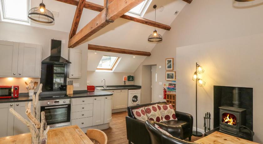 Bath or Shower, Bathroom, Children's high chair, Dining area, Dishwasher, Fireplace, Heating, Kitchen, Linen, Refrigerator, Seating Area, Shower, Sofa, Stovetop, Wardrobe/Closet, Washing Machine
