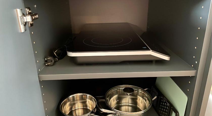 Bathroom, Coffee machine, Dining area, Dining table, Hairdryer, Heating, Kitchenette, Kitchenware, Linen, Microwave, Refrigerator, Seating Area, Shower, Stovetop, Toilet, Towels, TV