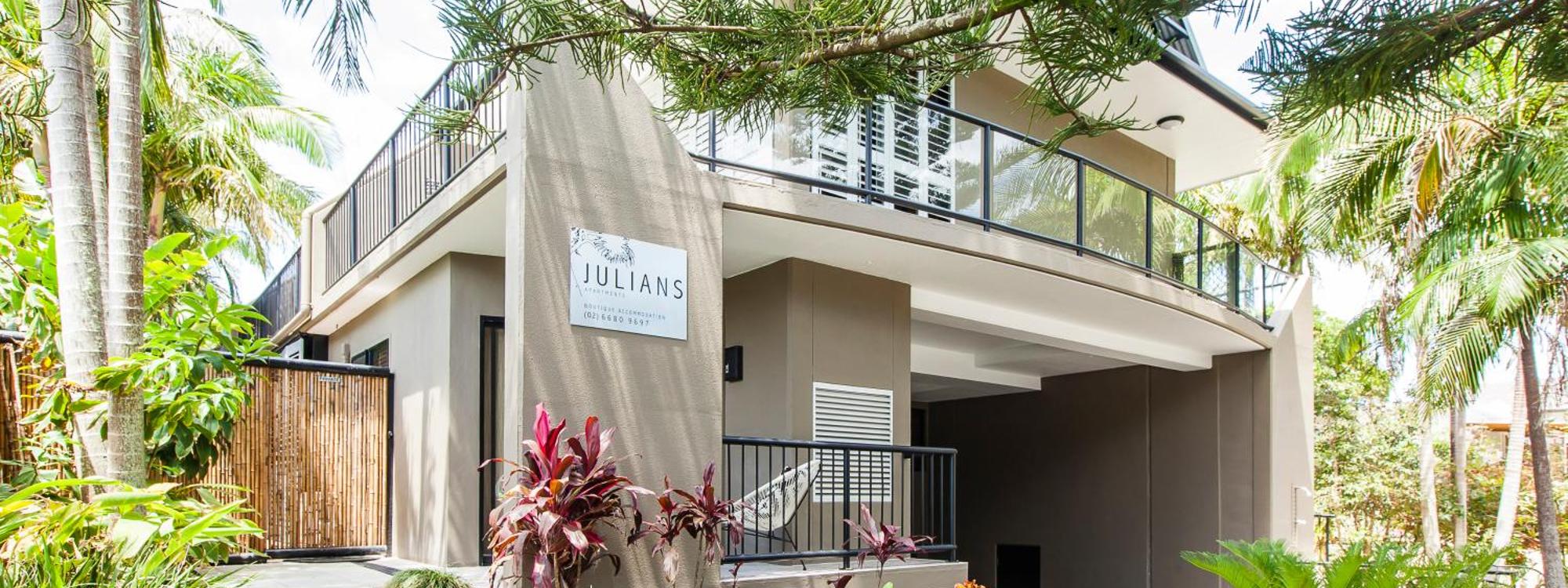 Julians Apartments offers 4-star boutique Byron Bay accommodation with fully equipped kitchen and laundry facilities. Guests enjoy free WiFi and modern studio apartments with a large balcony or courty...more