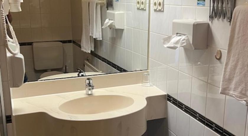 Modern decor & large spacious rooms that could curtain off for privacy. Large bathroom in good condition. Very clean. Elevator to upper floors. Breakfast was very good and included in the price. Lovely variety of breakfast options and nice dining room. Ample onsite free parking. WiFi. Central location for the town. Hairdryer in bathroom.