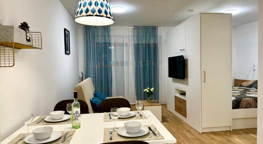 We stayed overnight in the apartment. It was good and accomodated 4 of us (2 adults, 2 kids) perfectly. Everything was explained in the check-in notebook, and went smoothly. The garage was available in the building, which is a big plus, and a bed plus sofa bed was enough for our short stay. The balcony was also a really nice. We would recommend to couples or families with two small kids.