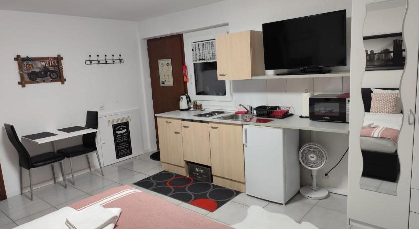 The studio is spotlessly clean with a well-equipped kitchenette and a fridge. The room is large with a very comfortable bed, we appreciated the modern and silent fan in the hot summer temperatures, the shower has good pressure. The garden is a lovely place to relax, parking is secure behind a gate, but the best is the owners! Very welcoming, exceedingly helpful and kind. We stayed for 4 nights and thoroughly enjoyed every minute. The location is quiet for a good rest and the village is good for early morning and late evening walks. We highly recommend this studio.