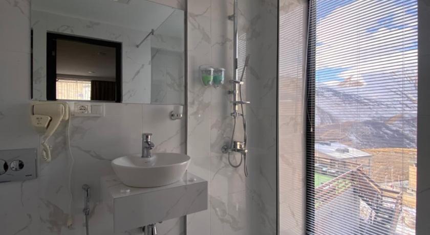 George, the owner, and his family were lovely. Very helpful and welcoming. Room was great, they even upgraded me from a single to double room at no extra cost. Hotel and room clean and tidy. Bed very comfortable. Lovely Georgian food served for breakfast and dinner. Short walk to ski hire and lift Exceptional value. Would recommend.
