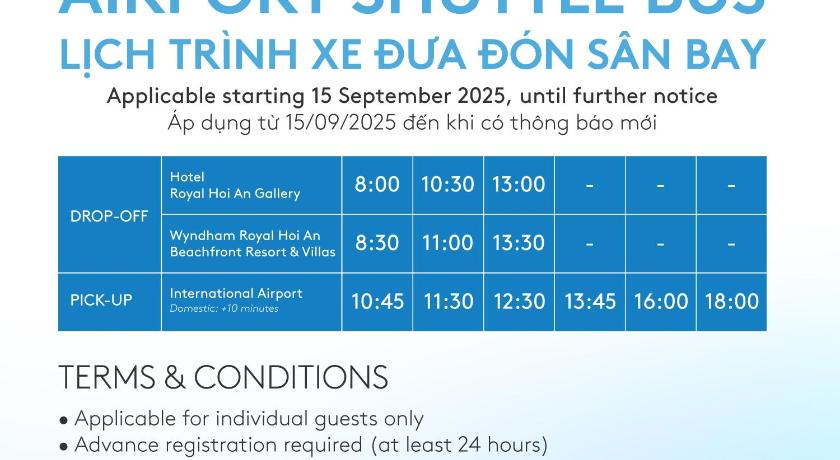 Breakfast is served at the Royal Shore Beach Club restaurant, A la carte or buffet breakfast.Complimentary use of the Main pool at Condo A, the Beach Pool at Royal Shore Beach Club, An Bang Beach is available, with free towels provided.A Complimentary shuttle service to Hoi An Ancient Town, according to the resort's bus schedule, is available upon request and needs to be booked in advance.The gala dinner for December 31, 2025, is included in the price.Guests under the age of 18 can only check in with a parent or official guardian.