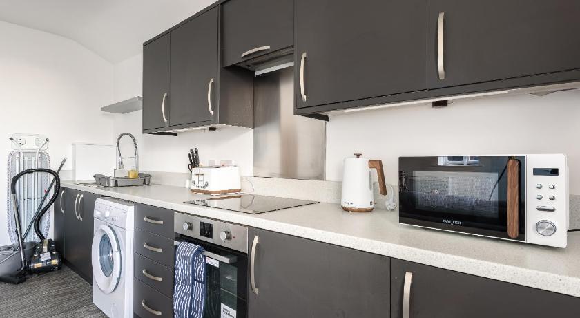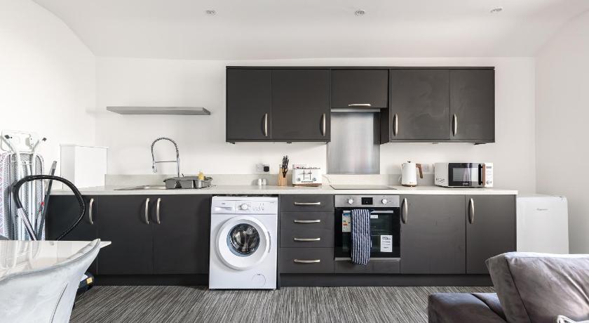 Bathroom, Carpeted, Dining table, Electric kettle, Flat-screen TV, Hardwood/Parquet floors, Heating, Kitchen, Kitchenware, Linen, Microwave, Oven, Private flat in building, Refrigerator, Seating Area, Shower, Sofa, Stovetop, Toaster, Toilet, Towels, TV, Upper floors accessible by stairs only, Wardrobe/Closet, Washing Machine