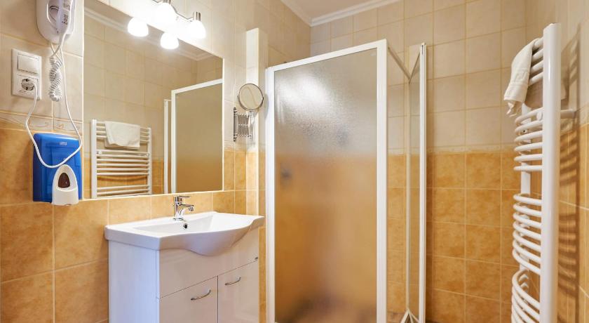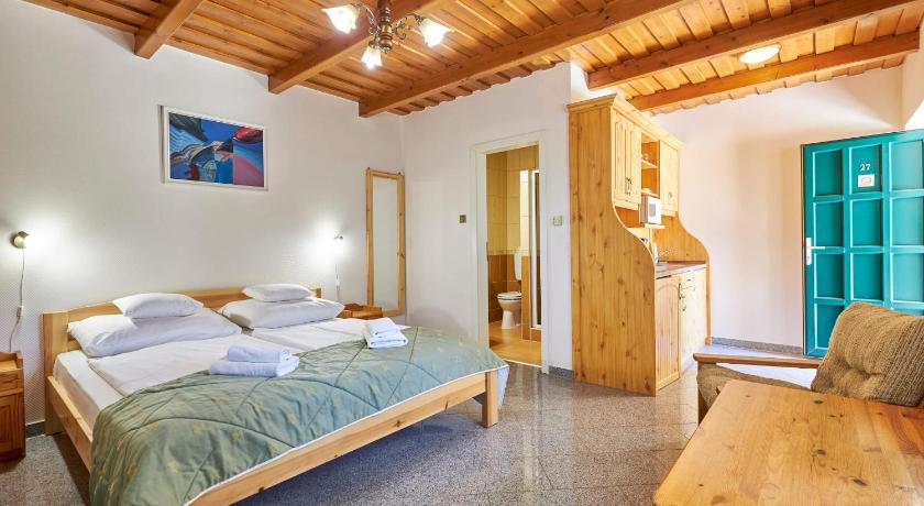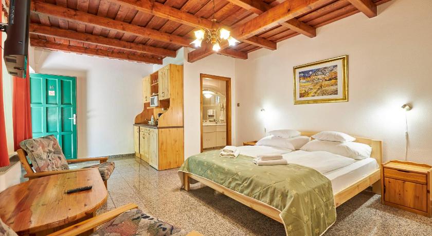 Nice and quiet manor with a restaurant, lake, stable, and winery nearby. Clean and large room with fridge and AC. The pool area is very nice with warm water, suitable even for small kids. Showers and locker available near the pool area. Lots of parking lots are available.