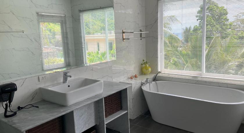 We was met by a friendly staff member who got us in to the property but was not actually the manager, as we had been travelling so long we requested a 6pm meet with the manager, to pay the security deposit (we arrived at midday) so we could get some rest and this was honoured by the manager. He sent water and electric metre reading in advance and was a real nice guy. The size of this place under sells it's self, bottom floor has a huge living room, toilet and kitchen, with table top oven, microwave, kettle, toaster, fridge freezer, stencils of a good quantity and a machine with fresh drinking water, with spares and outside balcony, second floor has 1 huge double bedroom with ensuite shower and bath, round the corner, are 2 further double bedrooms (both with a balcony) of a good size and another toilet and shower, 3rd floor has a large double bedroom with balcony, another shower in the hall and a huge loft like living room with fantastic views out over Kata and the sea and the big Buddha, this is from the living area combined with the very large top balcony. There is a washing room, washing machine is great and has maidens to hang clothes. All the house is decorated to a decent standard. The house/villa has Aircon throughout.
