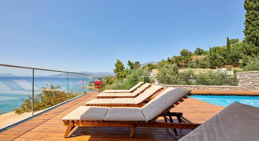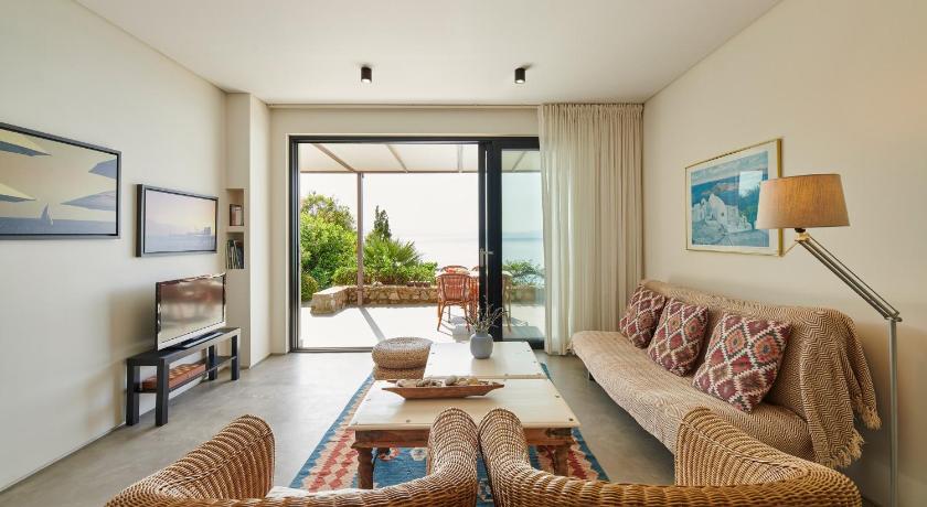 It’s a beautiful building of three holiday flats which are superbly designed and all have amazing views over the pool and the bay. The small private beach is down the steps and perfect for a swim. There are three tavernas in the next bay which it’s possible to swim to for lunch, and also one along the road in the opposite direction. Our host, Dia, was fantastic. Charming, helpful but not intrusive, she booked a couple of restaurants for us and gave some other tips for walks and drives out. Overall a delightful stay