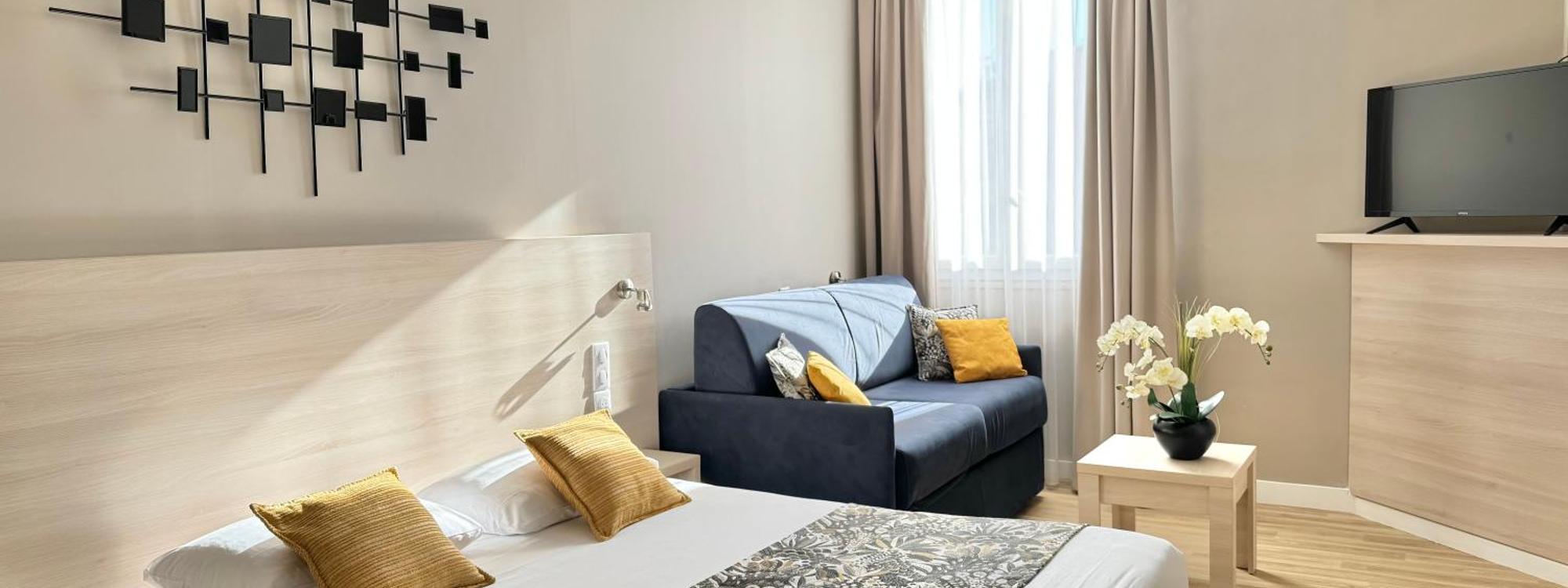 This hotel is located in the centre of Nice, just 700 metres from the Promenade des Anglais and the beach. It offers air-conditioned guest rooms and free Wi-Fi internet access.A flat-screen TV with sa...more