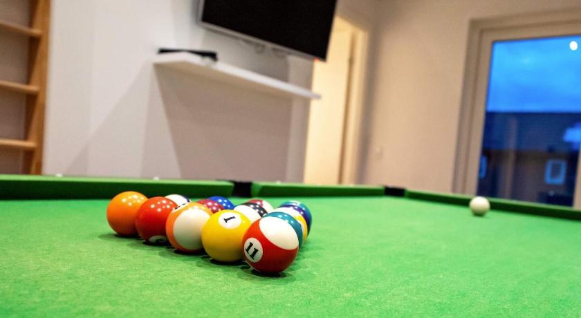 Sauna and hot tub, spacious interior, with enough space to sleep up to 10 people. There's also a cozy fireplace, but you'll need to go get your own wood. If that's not enough, there is also a pool table!
