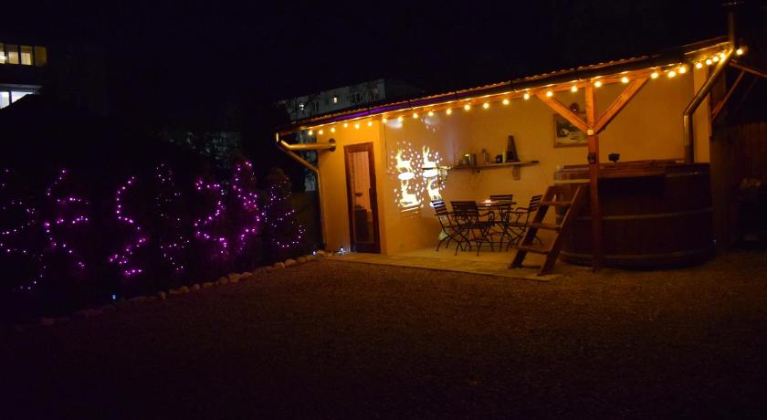 Little cottage, detached, separate entrance, close to a medieval-like larger house/building, placed into a garden with grass and beautiful flowers. The place opens to the main street, and even though it is in the city center, it is far from the noise due to the large gate that separates the yard and the garden from the street, the whole space offering intimacy . Very clean, the open kitchen at the ground level it’s basically equipped with all you need for making a simple breakfast or even an more elaborate dish- if you’re not in the mood for tasting the local food in a restaurant. At the first floor is the matrimonial bedroom, you can accommodate also two children downstairs, in the open kitchen , where you have a twin bed. It’s also offered a parking space inside the yard, near to the spa area. The venue has also a little sauna and a jacuzzi ( ciubăr), a terrace, possibility to barbecue. The host is very polite and client oriented.