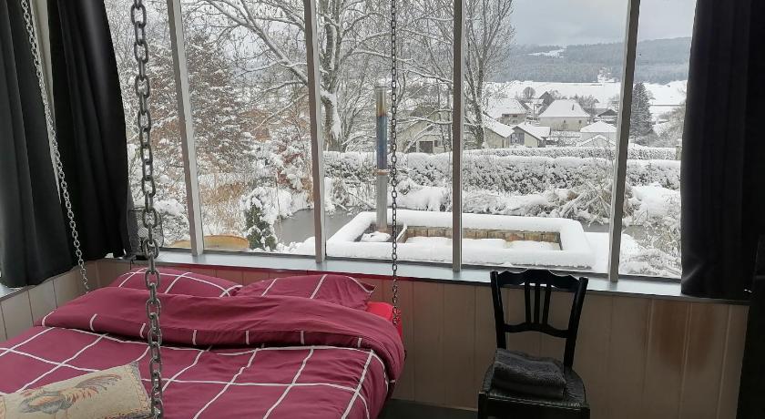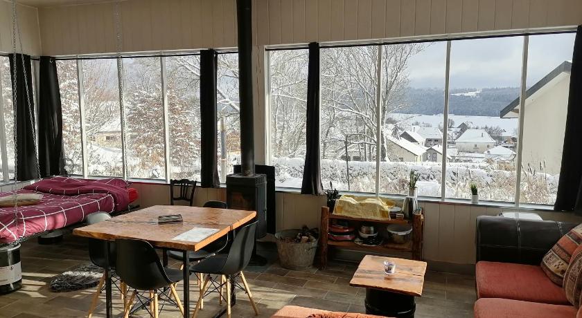 Very inexpensive. Hosts are friendly. Nice area in the small city of Orchamps. Close to supermarket and wash machines. Great with a kitchen and sofa and table.