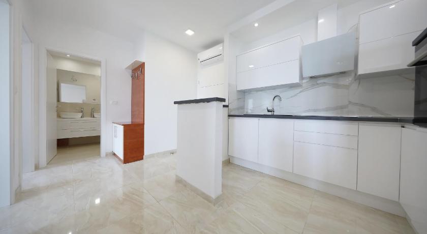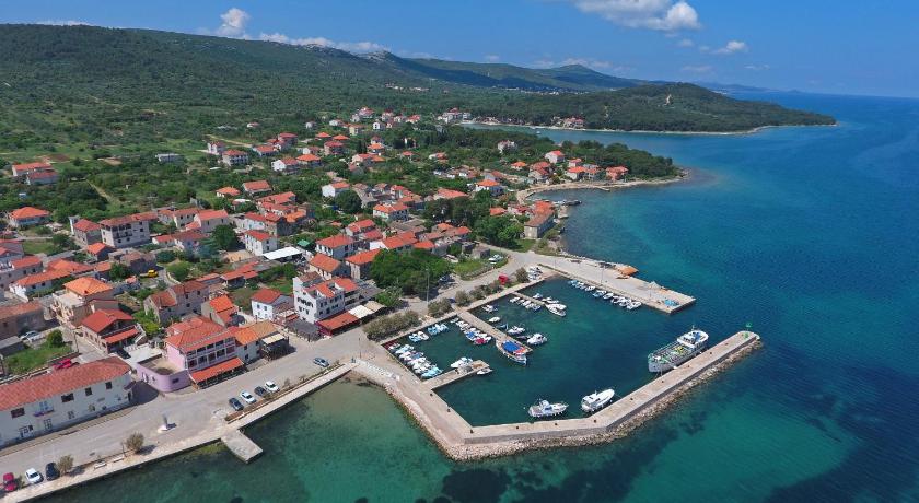 Beautiful aptartman and view from the terase (btw terase is placed out of apartman upstairs). A few restaurans near by. Good location for trips to the island. Private parking. I recomend it.