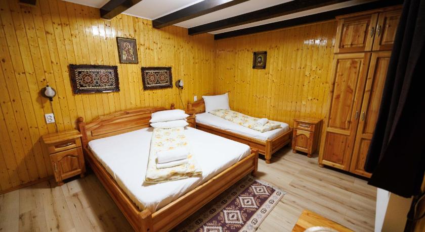 A good starting point for the Transalpina, covered parking included, outdoor and indoor seating available, and a shared kitchenette is also provided.