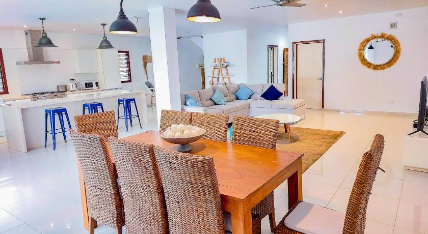 This is a very spacious home with 3 huge bedrooms upstairs and a small one downstairs which was perfect for us and our 2 teens who need their own space. The kitchen is very well appointed and great for self catering. It's about 10mins out of town, so we found a hire car really useful. The location is idyllic - direct access to a private beach - great for snorkelling, swimming and kayaking and watching the sun set with a bevvie!