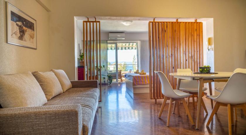 Air Conditioning, Balcony, Bath or Shower, Bathroom, Dining area, Dining table, Dishwasher, Electric kettle, Flat-screen TV, Garden view, Hairdryer, Hardwood/Parquet floors, Heating, Kitchen, Kitchenette, Linen, Private flat in building, Refrigerator, Sea view, Seating Area, Shower, Stovetop, Terrace, Towels, TV, View