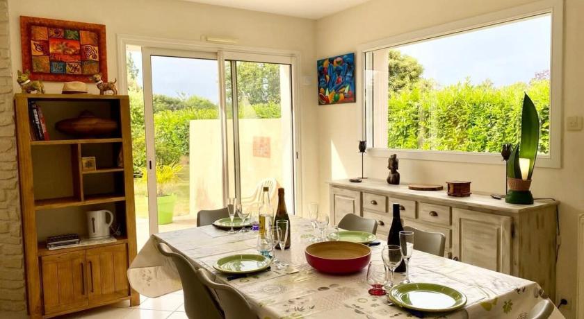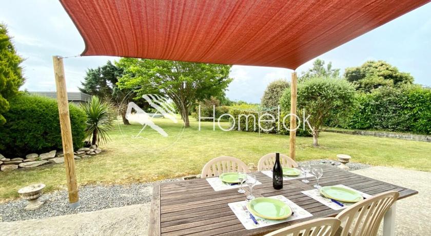 The house is located on the edge of a small village in a dead-end street (there is possibility to continue by foot for a walk). It has spacious rooms on the first floor and a large and luminuous living space and kitchen. The garden is huge and lounge chairs and a hammock are at the guest's disposal. There's also a garage to park your car. The beach (Linès-Gâvres) is at 10 minutes by car.