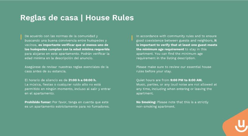 EUR 50 for arrivals after 00:00.DO NOT BOOK BEFORE READING THESE RULES.In accordance with Community rules and aiming for good coexistence between guests and neighbors, at least one member of your group must be over 25 years old to stay in this apartment.No Smoking: Please notice that this is a strictly non-smoking apartment.