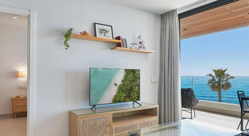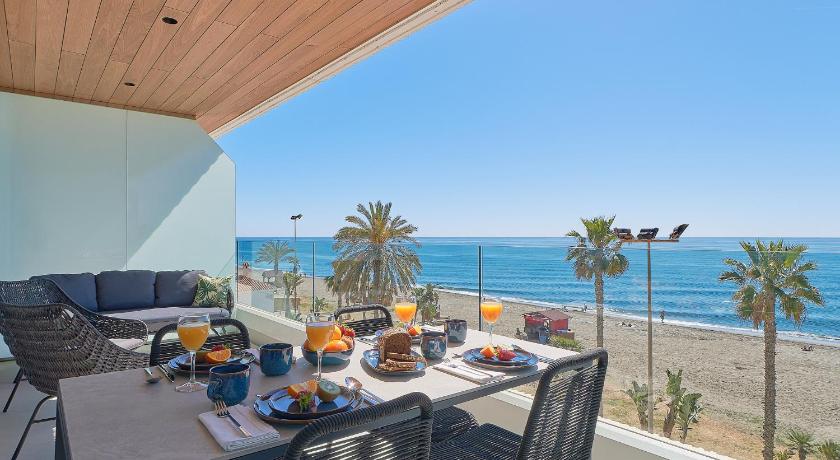 The apartment is front line, right on the beach with fantastic sea views from the floor to ceiling windows from the living room and the bedroom.The apartment is very modern and contains everything that you need.No car is necessary as everything is close by including a bakery across the road and supermarket 5 minute walk away.Buses to Malaga stop outside the door.Because the road runs behind the apartment it is very quiet and peaceful.The promenade in front of the apartment stretches for miles and we loved the 30 minute walk to Calle del Moral along the sea front.