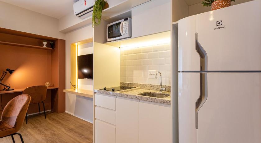 Spacious apartment with a big refrigerator, cooktop and microwave oven.