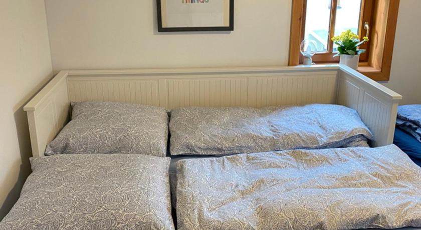 Superbly equipped and decorated with taste apartment in a quiet neighborhood. There is no shortage of attractions for children (trampoline, sandbox, swing). The morning silence here is captivating. And if you like animals, you will appreciate the company of dogs and a rooster. The owners are very friendly, communicative, and helpful. We have very fond memories of our time spent there. If we return to this area, it is only there 😁.