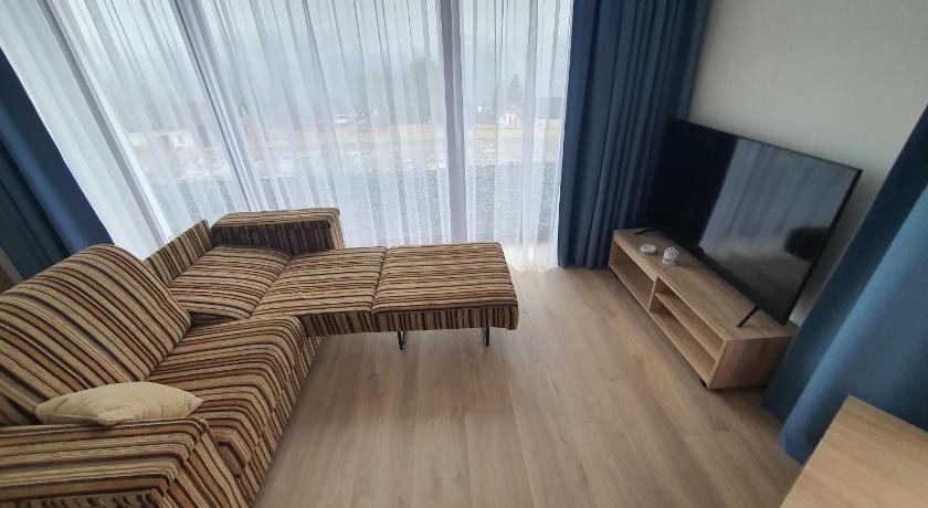 Apartment is new, clean and very good equipped - all basics you need are there (towels, kitchen dishes, coffee maker etc). Lots of space, pleasant view outside big windows, free parking spot. Walking distance to the center, although you need to climb up a bit when coming back. Host is helpful and nice.