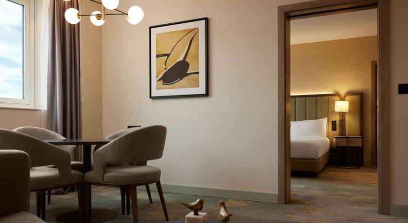 Located in Sofia’s center, Hilton Sofia is next to the South Park and opposite the National Palace of Culture. Next to the hotel is the European Union metro station, which takes guests to Airport in 25 minutes. Free Wi-Fi is available in public areas, and a free connectivity station with Apple and PC computers and printer is provided in the lobby.The newly refurbished and soundproof rooms at Hilton Sofia are decorated in warm colors and offer panoramic park, city and mountain views, as well opening windows, mini-bar, smart TV, tea & coffee makers and safety deposit box. All rooms also feature a 40-inch LED flat-screen TV and a spacious seating area and working space.A rich buffet breakfast is served daily at Hilton Sofia.Guests in Executive rooms and suites can enjoy an addition voucher of 30 BGN Food & Drinks credit, per adult, per day and 4 complimentary minibar items.Main pedestrian shopping street - Vitosha is just a 5-minutes’ walk away and Alexander Nevsky Cathedral is 20 minutes walking. A daily airport shuttle is offered upon request.Guests are required to show a photo identification and credit card upon check-in. Please note that all Special Requests are subject to availability and additional charges may apply.