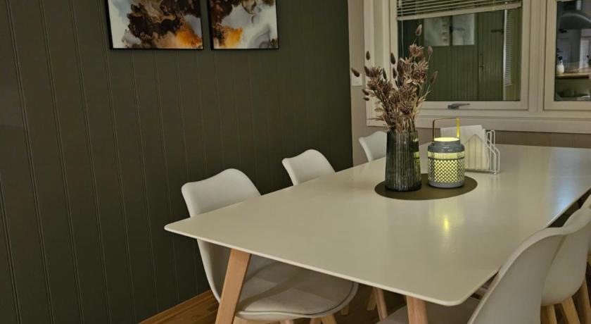 The location was fantastic, such beautiful views and a really nice, safe neighbourhood. Just a short 20-minute bus ride into the main centre of Tromso and very convenient to get to and from the airport. The apartment itself is very well set up. The kitchen has every bit of equipment you could ask for, we had no problem filleting a big fish we caught and frying it up for dinner using the kitchen utensils available to us.. The air fryer was a nice surprise! 😀 The bathroom with the washing machine and tumble dryer was a big hit with us, in fact one of the main reasons we picked the apartment as we wanted to travel light and needed the option to wash our fishy clothing. There was a huge amount of storage to unpack our clothes and store our suitcases and loads of room to relax on the big couch in the living room with amazing views over the harbour and surrounding mountains. Our kids absolutely loved sledging in the hills just behind the house, taking advantage of some of the sledges offered by Linn & Berger. Overall, we couldn't have asked for anything more from a holiday apartment. Fantastic hosts who were on hand whenever we needed them and just generally really lovely people.We will definitely back!