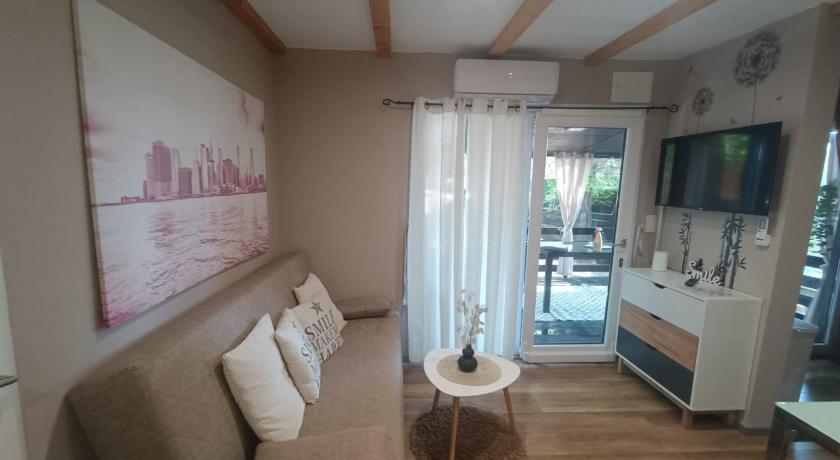 Great location, the mobile home is in the shade some steps away from the waterfront. Fresh brease from the sea, little side view to the sea as well. The terrace has a great size, actually we used it as a living room.